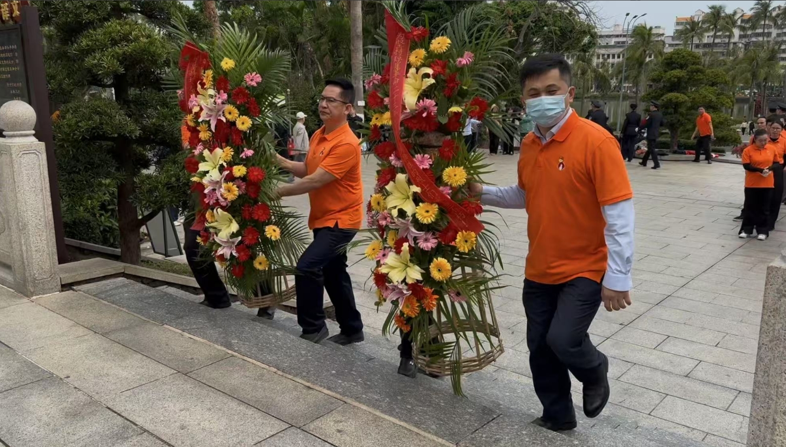 经过一段时间的等待才轮到金沙城。金沙城首先向烈士敬献花篮,花篮缎带上写着“为坚持琼崖革命23年红旗不倒牺牲的烈士们永垂不朽!”“为解放海南岛渡海牺牲的烈士们永垂不朽!”鲜艳的花篮寄托金沙城对革命先辈的崇敬和哀思。